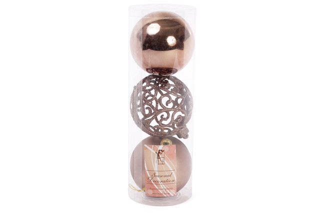 Набір ялинкових куль Ажур 8см, колір - карамельний мокко, 3шт: матовий, ажур з гліттером, глянець