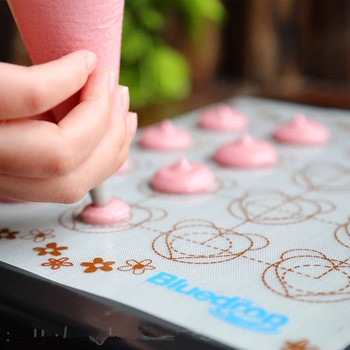 Макаронс – а саме так називається французьке тістечко - безе - складається з двох половинок, між якими міститься шар смачного наповнювача. Одним з обов'язкових атрибутів тістечка - безе є однакова форма і розміри «макаронинок». І тепер, завдяки килимку з розміткою, з'явилася можливість навіть в домашніх умовах виготовити вишукане традиційне ласощі.